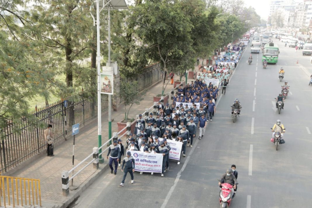आज बिहान ७ बजे भद्रकाली मन्दिर परिसरबाट नेपाल बीमा प्राधिकरणका अध्यक्षको नेतृत्वमा सबै बीमकका प्रमुख कार्यकारी अधिकृत सहितका कर्मचारीहरूको उपस्थितिमा सुरु भई रत्नपार्क परिक्रमा गरि भृकुटी मण्डपमा पुगेर कार्यक्रम समापन भएको थियो ।
