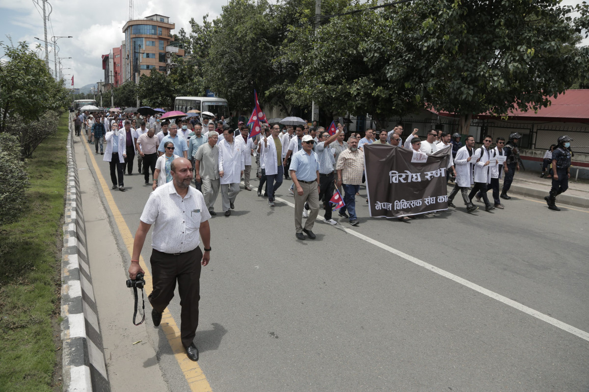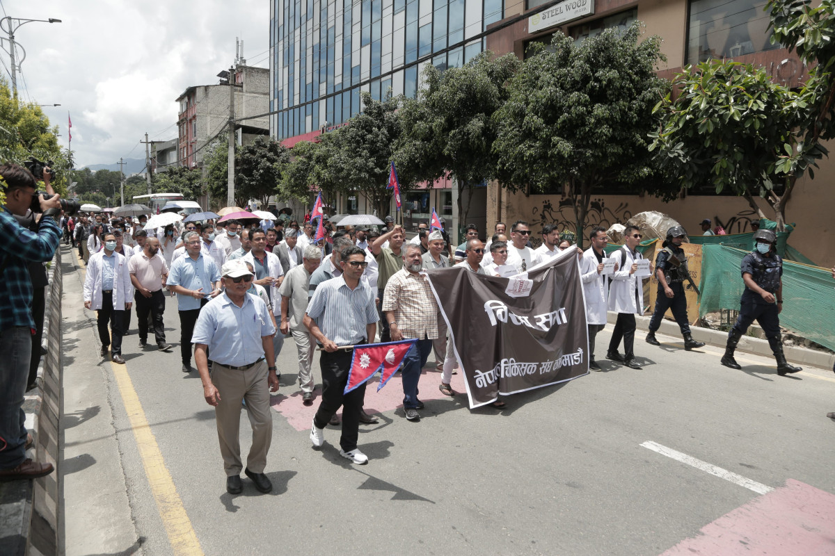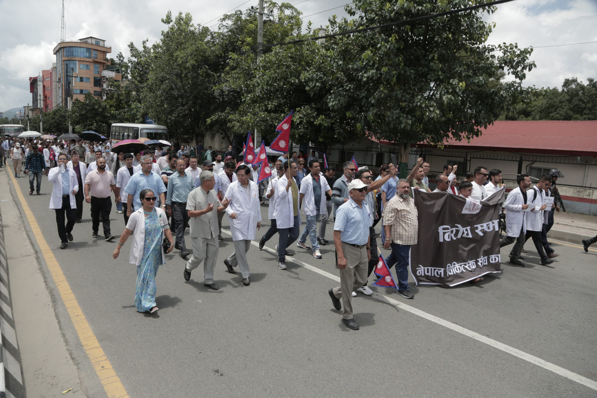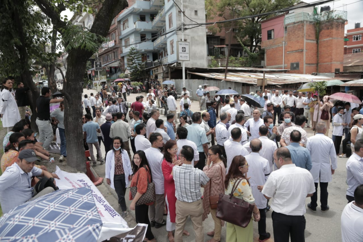 देशभरका अस्पताल तथा स्वास्थ्य संस्थामा आकस्मिक बाहेकका सम्पूर्ण सेवा बन्द गरेका डाक्टरहरू आज सेतो कोटसहित सडकमा उत्रिएका छन्। उपत्यकाभित्रका चिकित्सक तथा स्वास्थ्यकर्मीहरूले आज माइतीघर मण्डलामा धर्ना दिई बिजुली बजारसम्म र्याली गरी विरोध प्रदर्शन गरेका छन्।