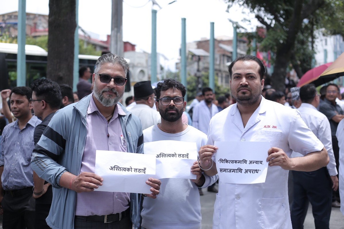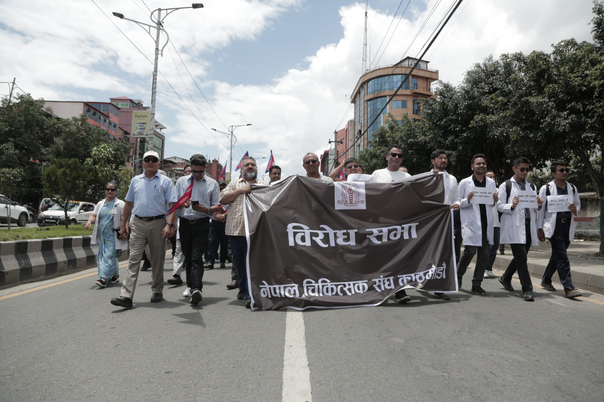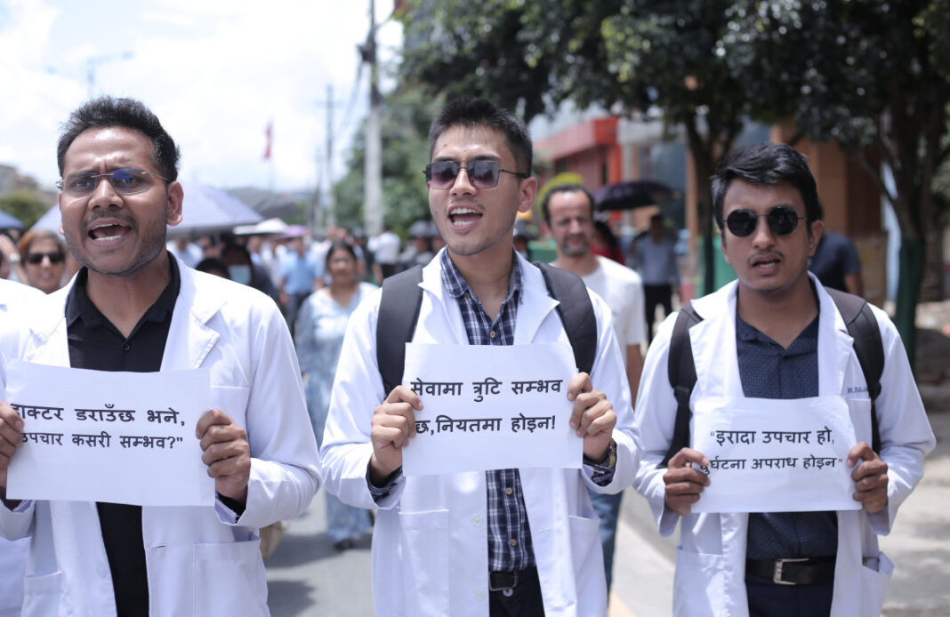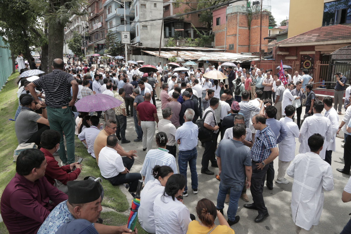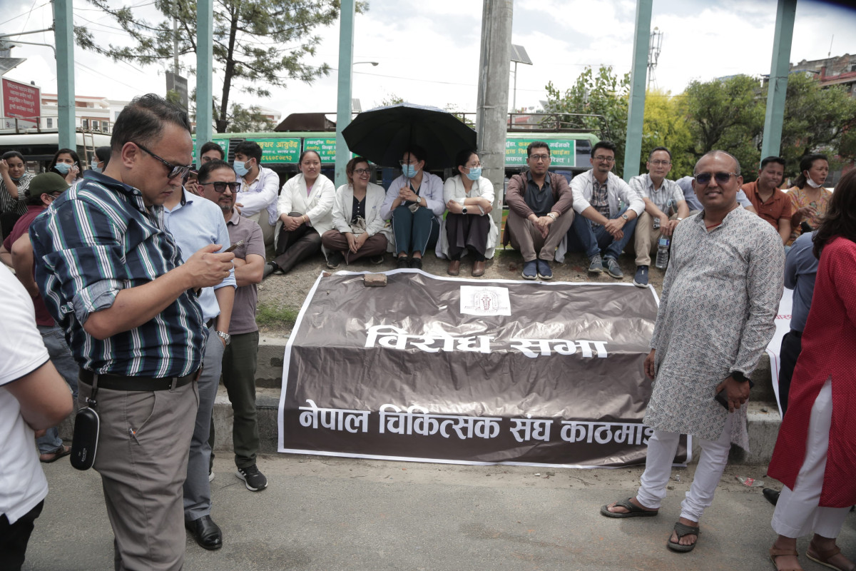 देशभरका अस्पताल तथा स्वास्थ्य संस्थामा आकस्मिक बाहेकका सम्पूर्ण सेवा बन्द गरेका डाक्टरहरू आज सेतो कोटसहित सडकमा उत्रिएका छन्। उपत्यकाभित्रका चिकित्सक तथा स्वास्थ्यकर्मीहरूले आज माइतीघर मण्डलामा धर्ना दिई बिजुली बजारसम्म र्याली गरी विरोध प्रदर्शन गरेका छन्।