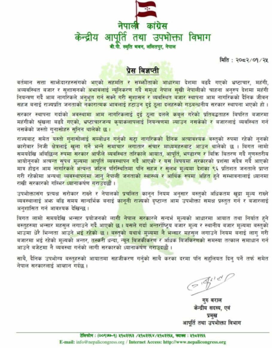 नेपाली काँग्रेसका केन्द्रिय सदस्य एंव केन्द्रिय आपुर्ति तथा उपभोक्ता बिभागका प्रमुख गुरु बरालद्धारा हस्ताक्षरीत प्रेस बिज्ञप्ती मार्फत सरकारको ध्यानार्कषण गराइएको छ ।